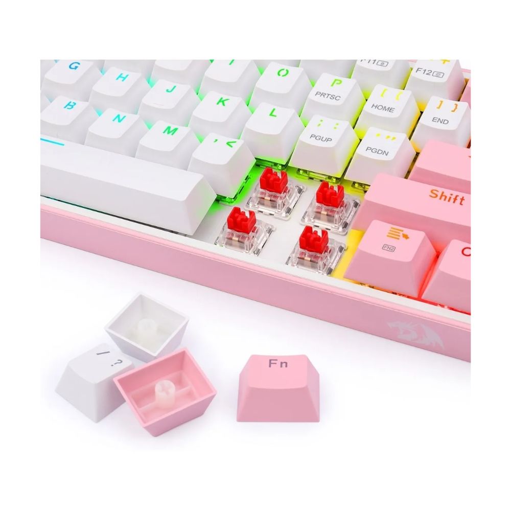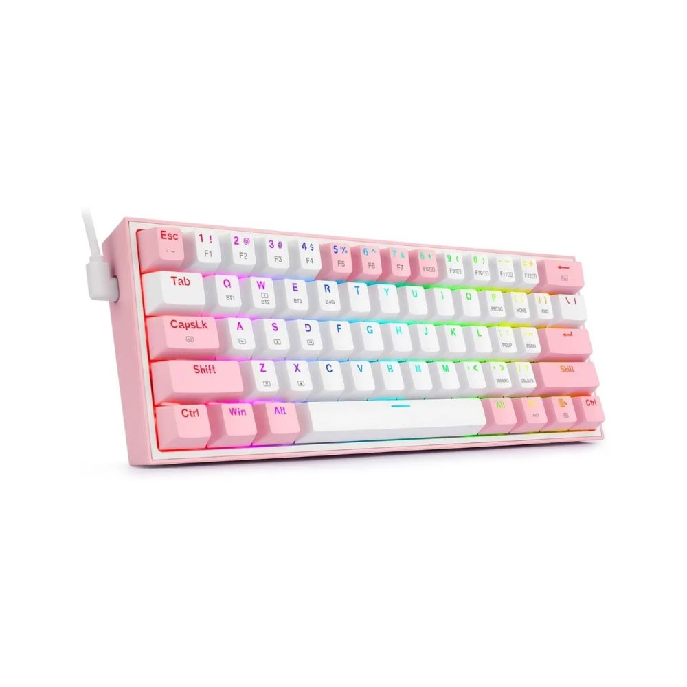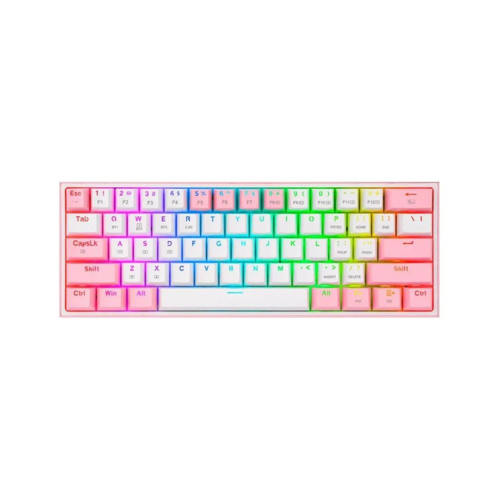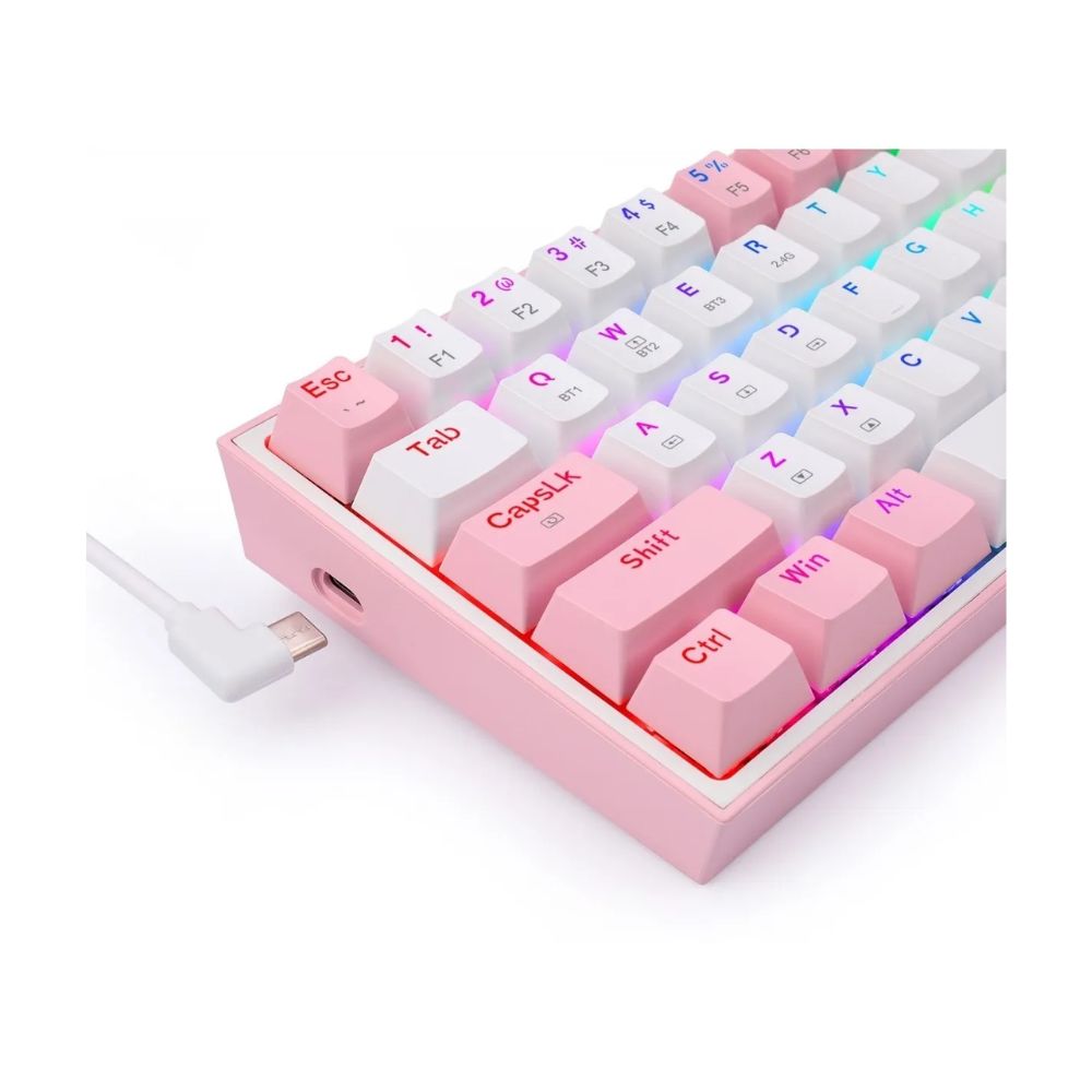 El Redragon K616-RGB Fizz Pro combina un diseño encantador en blanco con detalles rosados y lo mejor del rendimiento mecánico. Con una estructura compacta al 60%, conectividad inalámbrica triple y retroiluminación RGB, este teclado es ideal para gamers, streamers y creadores que buscan rendimiento y estética en un solo dispositivo.